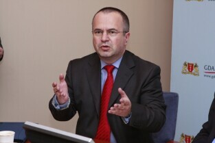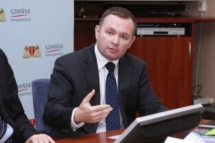 Urząd Miejski w Gdańsku. Podpisanie umowy na dofinansowanie projektu "Kompleksowe zabezpieczenie przeciwpowodziowe Żuław - etap I - Gdańsk". Nz. zastępca Prezesa Zarządu Narodowego Funduszu Ochrony środowiska i Gospodarki Wodnej Jan Majka.