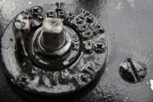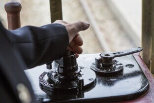 Gdańsk, przystanek Nowe Ogrody. Prezentacja zabytkowego tramwaju Ring, wyprodukowanego w 1930 roku w Gdańskiej Fabryce Wagonów. Nz. Wiceprezes Zakładu Komunikacji Miejskiej Maciej Lisicki prezentuje przedwojenny znak przystankowy znaleziony na Stogach