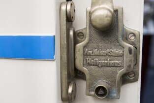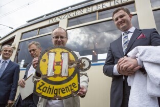 Gdańsk, przystanek Nowe Ogrody. Prezentacja zabytkowego tramwaju Ring, wyprodukowanego w 1930 roku w Gdańskiej Fabryce Wagonów. Nz. Wiceprezes Zakładu Komunikacji Miejskiej Maciej Lisicki prezentuje przedwojenny znak przystankowy znaleziony na Stogach, po prawej Z-ca Prezydenta Gdańska Piotr Grzelak