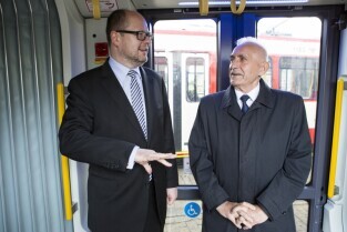 Gdańsk Strzyża. Wizyta w zajezdni tramwajowej Zakładu Komunikacji Miejskiej w Gdańsku. Nz. Prezydent Gdańska Paweł Adamowicz i Prezes ZKM Gdańsk Jerzy Zgliczyński
