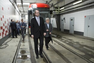Gdańsk Strzyża. Wizyta w zajezdni tramwajowej Zakładu Komunikacji Miejskiej w Gdańsku. Nz. Prezydent Gdańska Paweł Adamowicz