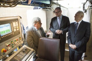 Gdańsk Strzyża. Wizyta w zajezdni tramwajowej Zakładu Komunikacji Miejskiej w Gdańsku. Nz. od lewej: Wiceprezes ZKM Gdańsk Maciej Lisicki, Prezydent Gdańska Paweł Adamowicz, Prezes ZKM Gdańsk Jerzy Zgliczyński