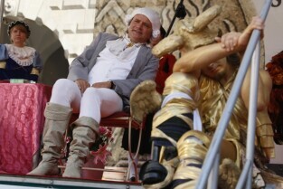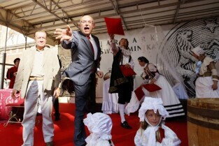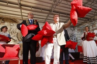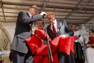 Gdańsk, Długi Targ. Zakończenie 752. Jarmarku św. Dominika. Nz. Prezydent Gdańska Paweł Adamowicz, Prezes MTG S.A. Andrzej Kasprzak i Radny Miasta Gdańska Piotr Dzik rzucają publiczności jarmarkowe pamiątkowe poduszki