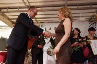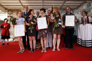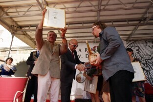 Gdańsk, Długi Targ. Zakończenie 752. Jarmarku św. Dominika. Nz. Prezydent Gdańska Paweł Adamowicz, Prezes MTG S.A. Andrzej Kasprzak i Radny Miasta Gdańska Piotr Dzik wręczają nagrody dla najlepszych wystawców