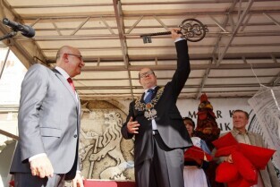 Gdańsk, Długi Targ. Zakończenie 752. Jarmarku św. Dominika. Nz. Prezes MTG S.A. Andrzej Kasprzak (po lewej) symbolicznie oddaje Prezydentowi Gdańska Pawłowi Adamowiczowi klucze do bram miasta
