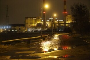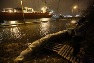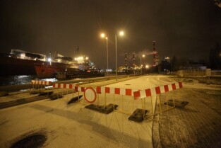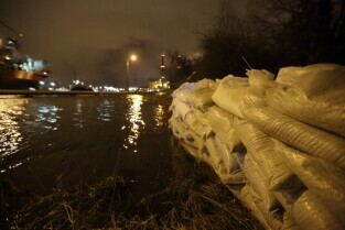 Gdańsk. Sztorm, wiatr i cofka na Wiśle! Nz. Strażacy postawili zaporę na ul Wiślanej.