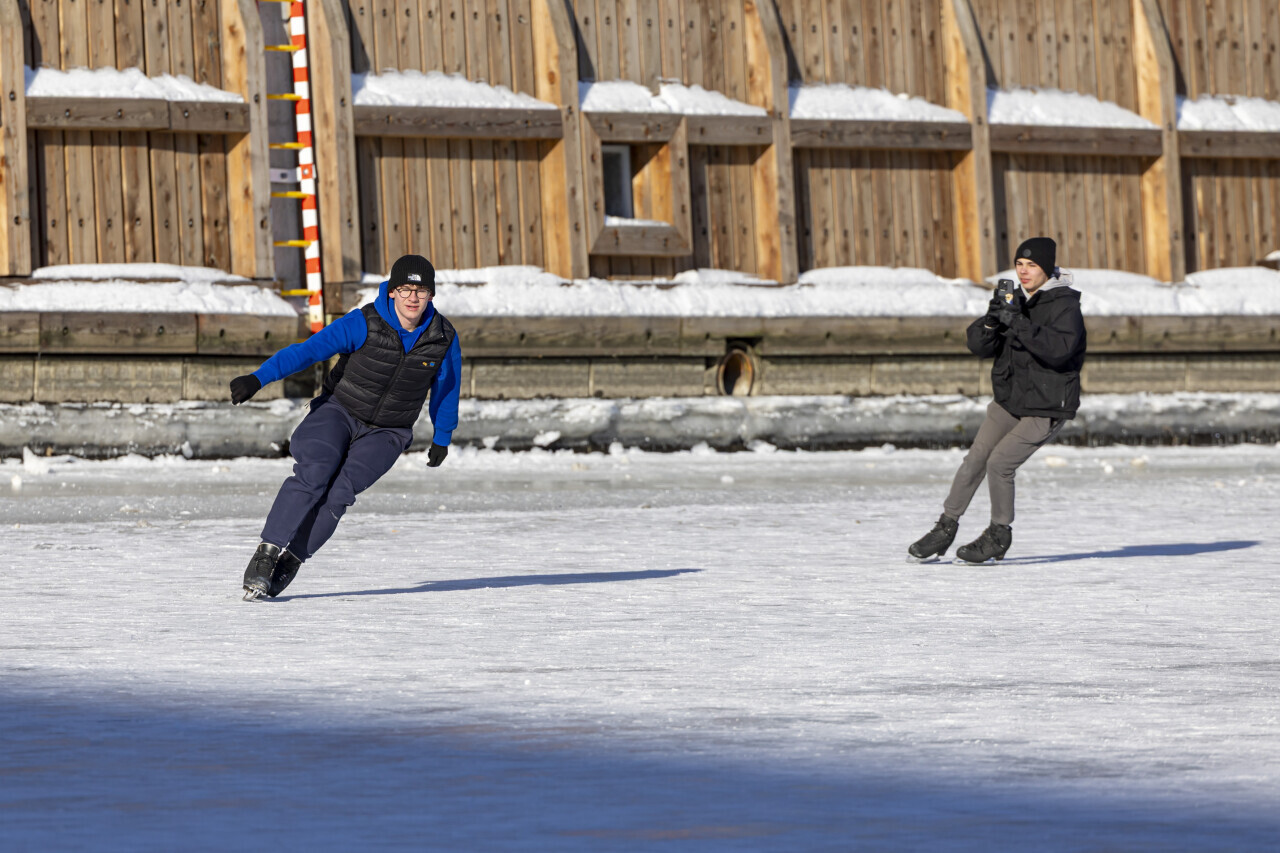 Gdańsk. Mieszkańcy i turyści przechadzają się lub jeżdżą na łyżwach po zamarzniętej Motławie wzdłuż Długiego Pobrzeża, obok statku muzeum Sołdek i pod kładką na Ołowiankę.