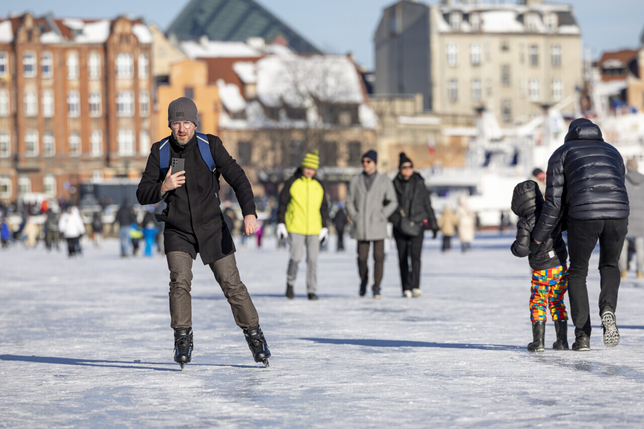 Gdańsk. Mieszkańcy i turyści przechadzają się lub jeżdżą na łyżwach po zamarzniętej Motławie wzdłuż Długiego Pobrzeża, obok statku muzeum Sołdek i pod kładką na Ołowiankę.