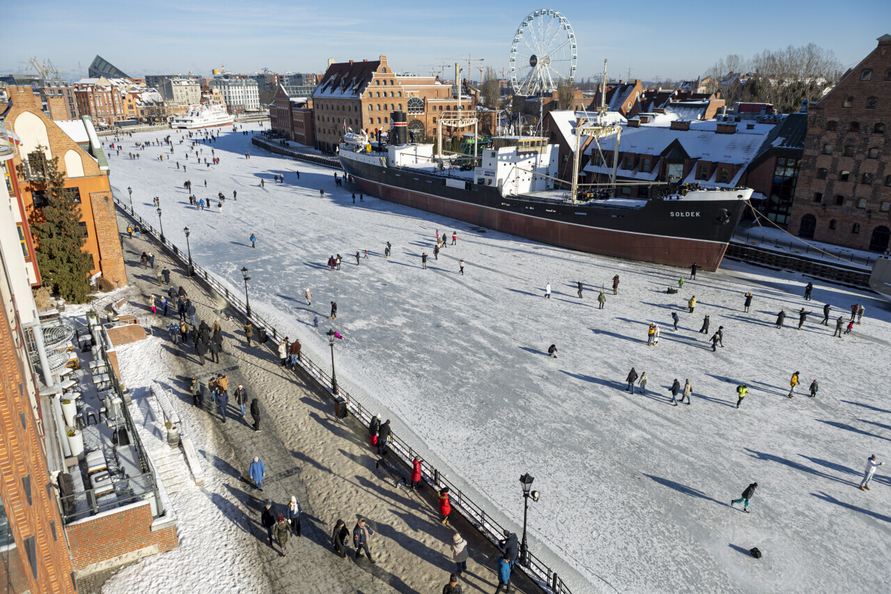 Gdańsk. Mieszkańcy i turyści przechadzają się lub jeżdżą na łyżwach po zamarzniętej Motławie wzdłuż Długiego Pobrzeża, obok statku muzeum Sołdek i pod kładką na Ołowiankę.