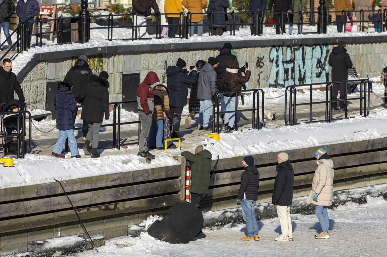 Gdańsk. Mieszkańcy i turyści przechadzają się lub jeżdżą na łyżwach po zamarzniętej Motławie wzdłuż Długiego Pobrzeża, obok statku muzeum Sołdek i pod kładką na Ołowiankę.