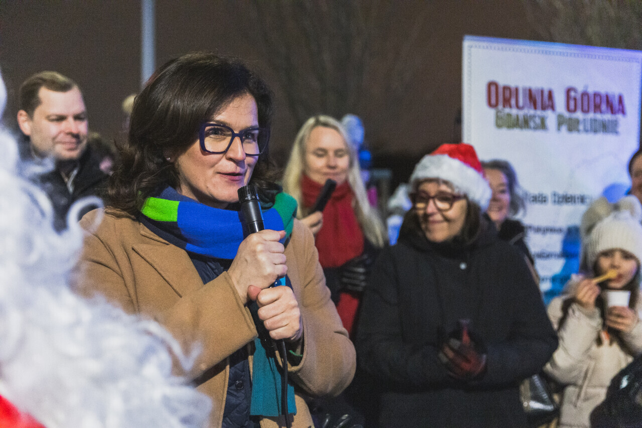 Gadańsk, przy zbiorniku Augustowska. Zapalenie światełek na choince w dzielnicy Orunia Górna - Gdańsk Południe. W wydarzeniu brała udział Aleksandra Dulkiewicz prezydent Gdańska, towarzyszyli jej radni miejscy i dzielnicowi.