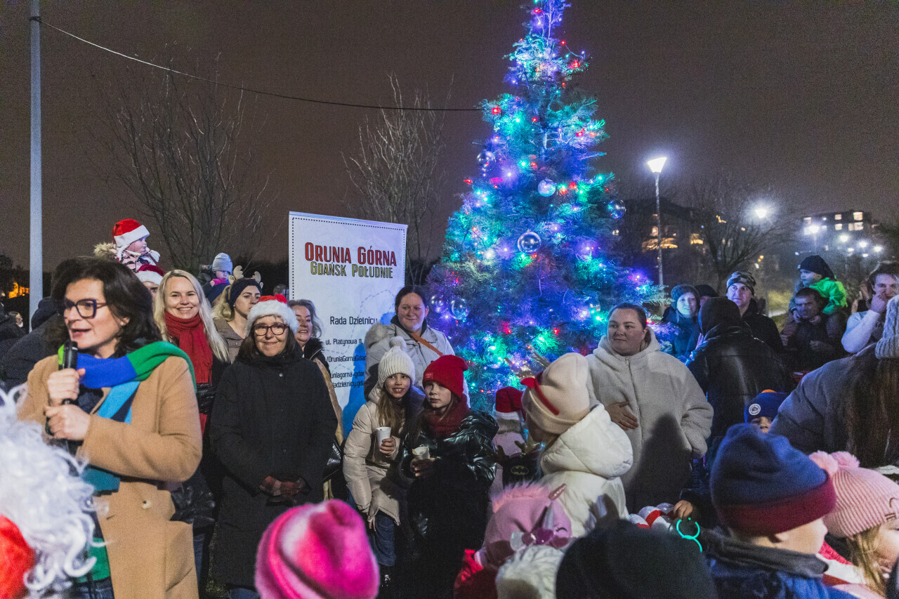 Gadańsk, przy zbiorniku Augustowska. Zapalenie światełek na choince w dzielnicy Orunia Górna - Gdańsk Południe. W wydarzeniu brała udział Aleksandra Dulkiewicz prezydent Gdańska, towarzyszyli jej radni miejscy i dzielnicowi.