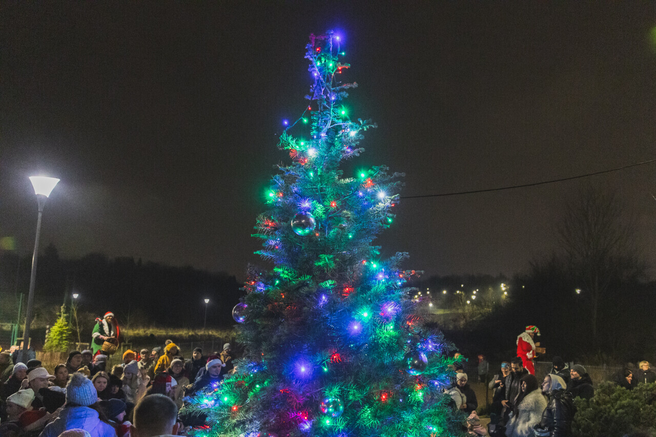 Gadańsk, przy zbiorniku Augustowska. Zapalenie światełek na choince w dzielnicy Orunia Górna - Gdańsk Południe. W wydarzeniu brała udział Aleksandra Dulkiewicz prezydent Gdańska, towarzyszyli jej radni miejscy i dzielnicowi.