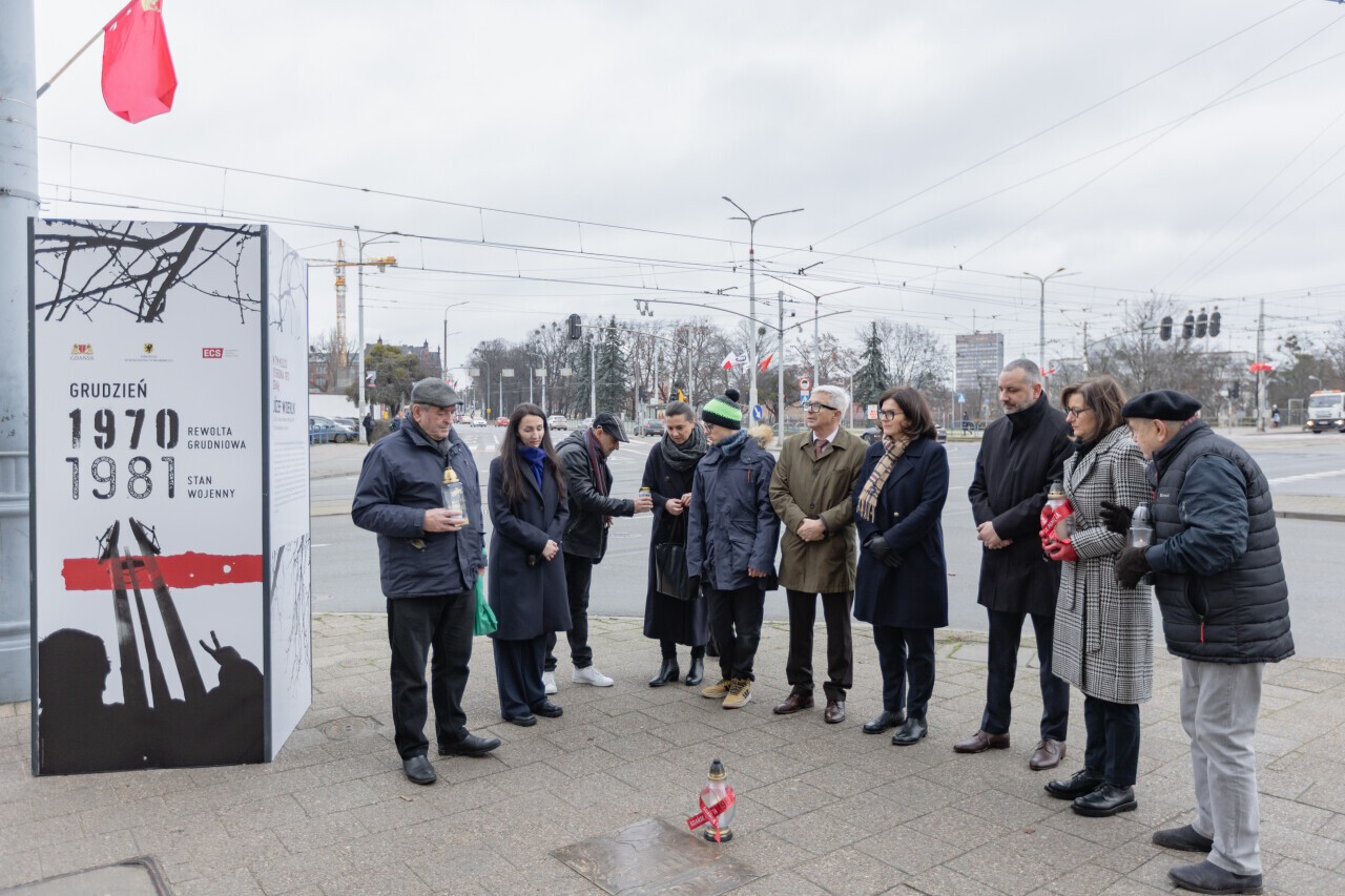 Gdańsk. Zapalenie zniczy w miejscach śmierci ofiar Grudnia ’70. Znicze zapaliła Prezydent Gdańska Aleksandra Dulkiewicz, przedstawiciele rodzin ofiar i ECS, oraz radny miejski Andrzej Kowalczys