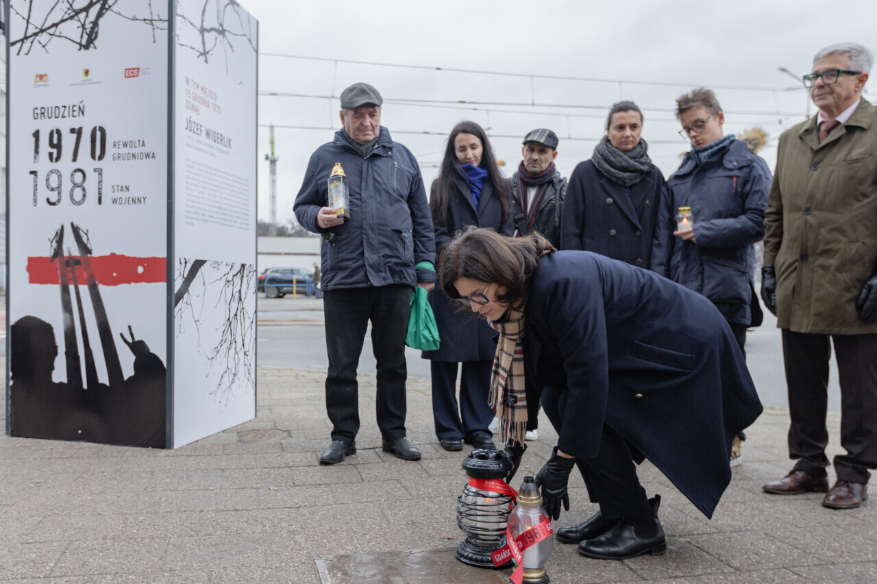 Gdańsk. Zapalenie zniczy w miejscach śmierci ofiar Grudnia ’70. Znicze zapaliła Prezydent Gdańska Aleksandra Dulkiewicz, przedstawiciele rodzin ofiar i ECS, oraz radny miejski Andrzej Kowalczys