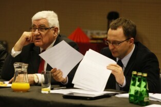 Posiedzenie Zarządu Stowarzyszenia Gdański Obszar Metropolitalny. Gdańsk, siedziba targów Amberexpo. Nz. od lewej: Paweł Adamowicz (Gdańsk) i Józef Reszke (Pow. Wejherowski)