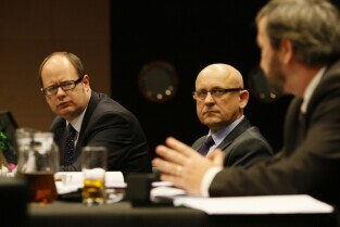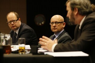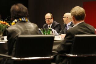 Posiedzenie Zarządu Stowarzyszenia Gdański Obszar Metropolitalny. Gdańsk, siedziba targów Amberexpo. Nz. od lewej: Hanna Brejwo (Gmina Pszczółki), Józef Puczyński (Pow. Tczewski), Marcin Skwierawski (Sopot)