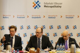 Posiedzenie Zarządu Stowarzyszenia Gdański Obszar Metropolitalny. Gdańsk, siedziba GOM przy Długim Targu. Nz. od lewej: Dyrektor biura GOM Michał Glaser, Prezes GOM Paweł Adamowicz (Prezydent Miasta Gdańska), Wiceprezes GOM Józef Reszke (Starosta Powiatu Wejherowskiego)