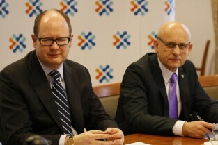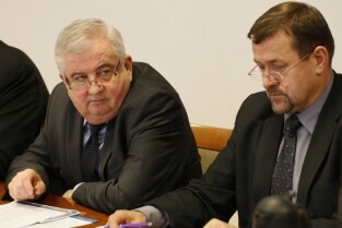 Posiedzenie Zarządu Stowarzyszenia Gdański Obszar Metropolitalny. Gdańsk, siedziba GOM przy Długim Targu. Nz. od lewej: Prezes GOM Paweł Adamowicz (Prezydent Miasta Gdańska), Wiceprezes GOM Józef Reszke (Starosta Powiatu Wejherowskiego)
