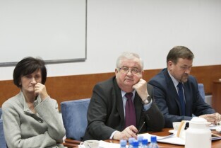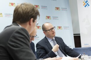 Urząd Miejski w Gdańsku. Spotkanie Zarządu stowarzyszenia Gdański Obszar Metropolitalny. Nz. od lewej: Hanna Brejwo, Jerzy Żurawicz i Wojciech Dettlaff