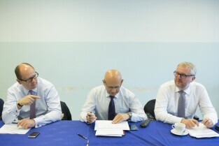 Spotkanie Zarządu stowarzyszenia Gdański Obszar Metropolitalny. Gdańsk, Wyższa Szkoła Bankowa. Nz. od lewej: Prezes GOM Paweł Adamowicz (Prezydent Gdańska), Wiceprezes GOM Józef Reszke (Starosta Wejherowski), Mariusz Wiórek (Wicestarosta Powiatu Tczewskiego)