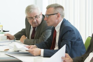Gdański Inkubator Przedsiębiorczości STARTER. Spotkanie Zarządu stowarzyszenia Gdański Obszar Metropolitalny. Nz. od lewej: Wiceprezes GOM Józef Reszke (Starosta Wejherowski), Prezes GOM Paweł Adamowicz (Prezydent Gdańska), dyrektor Biura GOM Michał Glaser
