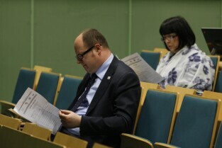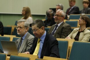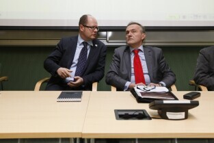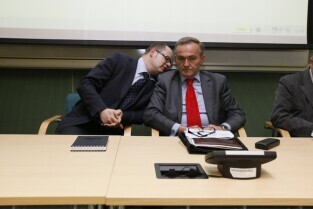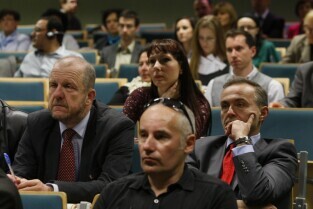 Konferencja naukowa "Zarządzanie Rozwojem Obszarów Metropolitalnych". Gdynia, Pomorski Park Naukowo-Technologiczny. Nz. po prawej Prezydent Gdyni Wojciech Szczurek, po lewej Wiceprezydent Gdyni Marek Stępa