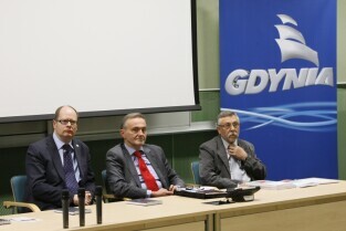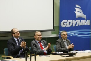 Konferencja naukowa "Zarządzanie Rozwojem Obszarów Metropolitalnych". Gdynia, Pomorski Park Naukowo-Technologiczny. Nz. od lewej: Prezydent Gdańska Paweł Adamowicz, Prezydent Gdyni Wojciech Szczurek, Prezes Towarzystwa Urbanistów Polskich Tadeusz Markowski