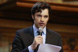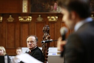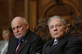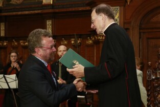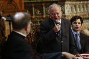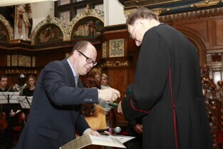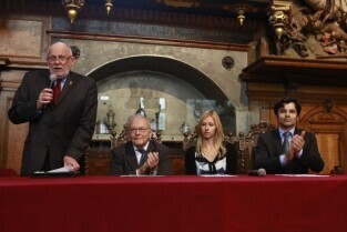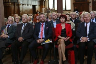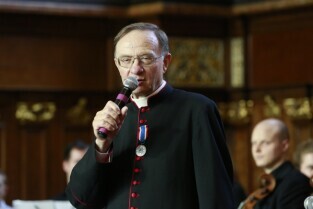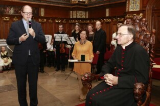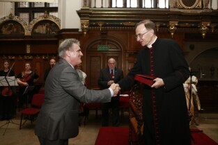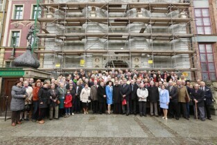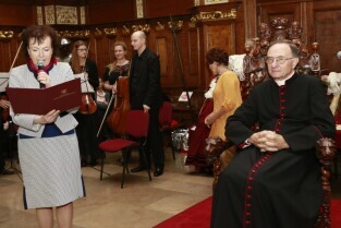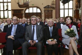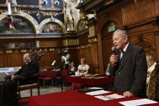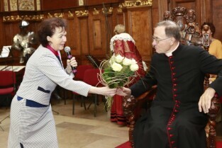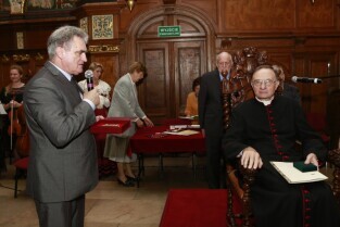 Gdańsk, Dwór Artusa. W ramach cyklu spotkań „Zasłużeni w historii miasta Gdańska”, miało dzisiaj miejsce uroczyste spotkanie z Księdzem Infułatem Stanisławem Bogdanowiczem.