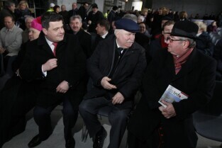 Gdańsk. Uroczystość zawieszenia wiechy na budowie Europejskiego Centrum Solidarności. Nz. od prawej: Marszałek Senatu RP Bogdan Borusewicz, były Prezydent RP Lech Wałęsa, Prezydent Gdańska Paweł Adamowicz