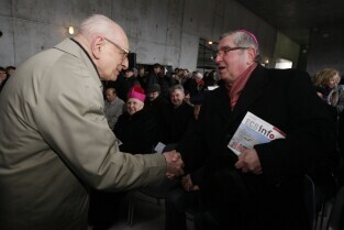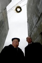 Gdańsk. Uroczystość zawieszenia wiechy na budowie Europejskiego Centrum Solidarności. Nz. Metropolita Gdański Abp Sławoj Leszek Głódź i Władysław Bartoszewski
