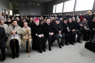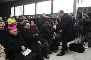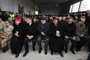 Gdańsk. Uroczystość zawieszenia wiechy na budowie Europejskiego Centrum Solidarności. Nz. od lewej: Zofia Bartoszewska, Abp Senior Tadeusz Gocłowski, Podsekretarz stanu w Ministerstwie Rozwoju Regionalnego Paweł Orłowski, były Prezydent RP Lech Wałęsa, Metropolita Gdański Abp Sławoj Leszek Głódź, Marszałek Woj. Pomorskiego Mieczysław Struk, Dyrektor ECS Basil Kerski