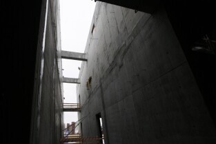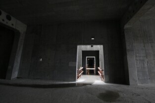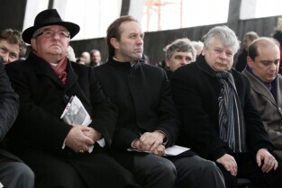 Gdańsk. Uroczystość zawieszenia wiechy na budowie Europejskiego Centrum Solidarności. Nz. od lewej: Metropolita Gdański Abp Sławoj Leszek Głódź, Marszałek Woj. Pomorskiego Mieczysław Struk, Marszałek Senatu RP Bogdan Borusewicz, Dyrektor ECS Basil Kerski