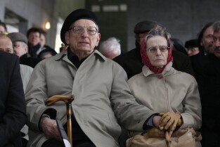 Gdańsk. Uroczystość zawieszenia wiechy na budowie Europejskiego Centrum Solidarności. Nz. Władysław Bartoszewski z żoną Zofią