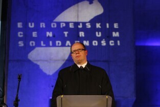 Gdańsk. Uroczystość zawieszenia wiechy na budowie Europejskiego Centrum Solidarności. Nz. Prezydent Gdańska Paweł Adamowicz