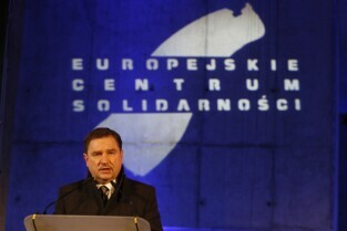 Gdańsk. Uroczystość zawieszenia wiechy na budowie Europejskiego Centrum Solidarności. Nz. Przewodniczący NSZZ Solidarność Piotr Duda