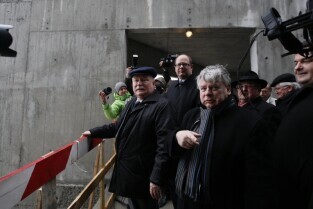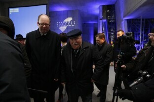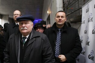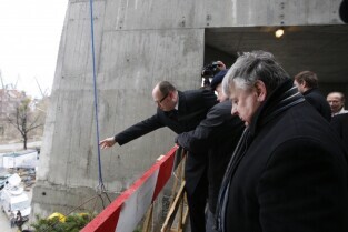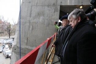 Gdańsk. Uroczystość zawieszenia wiechy na budowie Europejskiego Centrum Solidarności. Nz. od prawej: Marszałek Senatu RP Bogdan Borusewicz, były Prezydent RP Lech Wałęsa