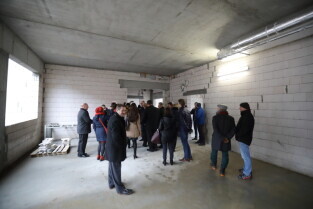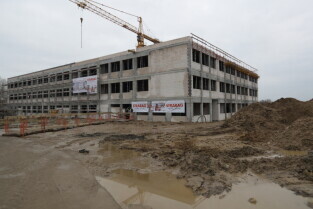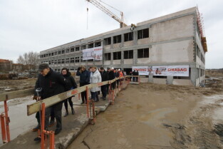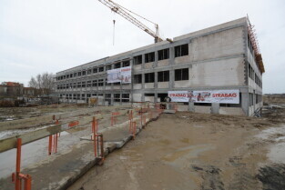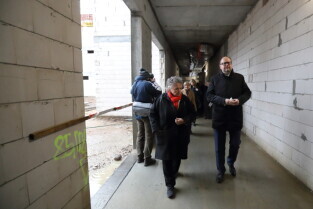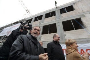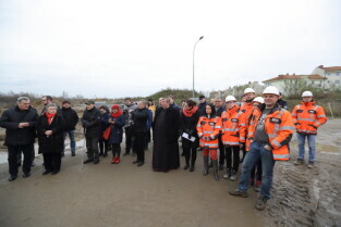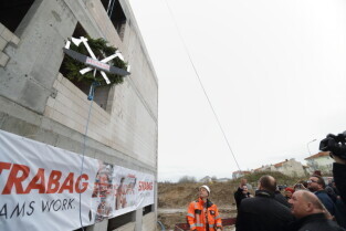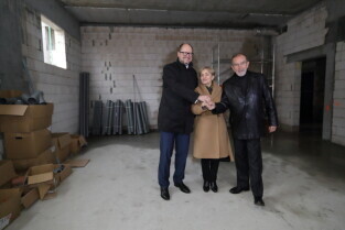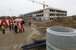 Gdańsk. Zawieszenie wiechy na budynku pierwszej Metropolitalnej Szkoły Podstawowej w Kowalach. Nz. Prezydent Gdańska Paweł Adamowicz, Wójt gminy Kolbudy Leszek Grombala oraz Wójt gminy Pruszcz Gdański Magdalena Kołodziejczak.