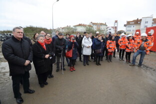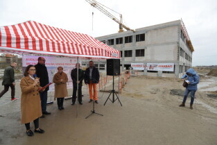 Gdańsk. Zawieszenie wiechy na budynku pierwszej Metropolitalnej Szkoły Podstawowej w Kowalach. Nz. Przewodniczący Rady Miasta Bogdan Oleszek, Radna Teresa Wasilewska i Wiceprezydent Gdańska Aleksandra Dulkiewicz.