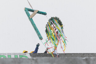 Gdańsk. Zawieszenie wiechy na szkole przy Morenowym Wzgórzu. Nz. radny Łukasz Świacki