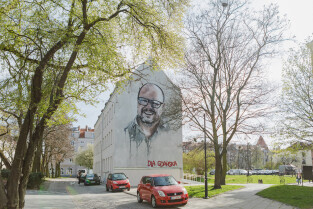 Zdjęcia wyremontowanej kamienicy z muralem P.Adamowicza