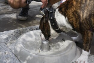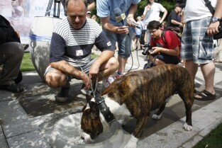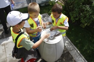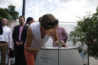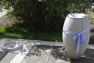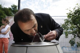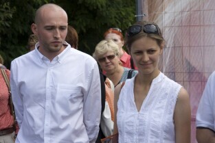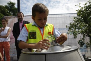 Gdańsk, Brzeźno. Konferencja prasowa związana z uruchomieniem nadmorskich zdrojów w Pasie Nadmorskim. Nz. (od lewej) autorzy projektu zdrojów Kaja Pobereżny i Michał Podgórczyk, zastępca Prezydenta Gdańska Maciej Lisicki, Dyrektor ds. techniczno-operacyjnych GIWK Ryszard Gajewski i Prezes Zarządu GIWK Jacek Skarbek.