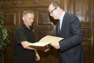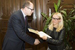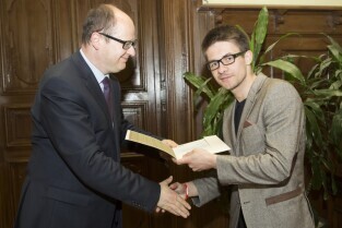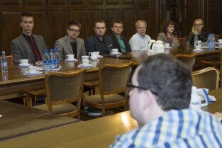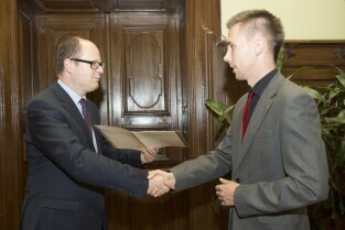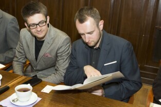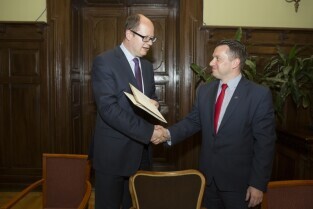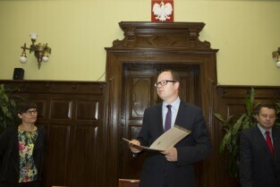 Prezydent Gdańska Paweł Adamowicz wręcza nominacje członkom Zespołu Konsultacyjnego Budżetu Obywatelskiego 2015, którego zadaniem będzie ocena formalna zgłoszonych projektów. Gdańsk, Nowy Ratusz