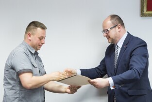 Urząd Miejski w Gdańsku. Spotkanie Zespołu ds. Budżetu Obywatelskiego. Nz. Prezydent Gdańska Paweł Adamowicz wręcza nominacje na członka Zespołu, który otrzymuje Maciej Kukla (Przewodniczący)
