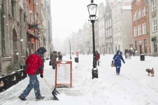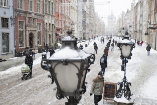 Gdańsk. Ulica Długa podczas obfitych opadów śniegu