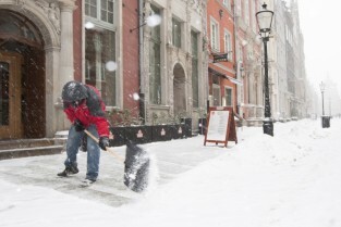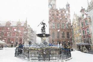 Gdańsk, Długi Targ. Fontanna Neptuna podczas obfitych opadów śniegu
