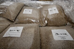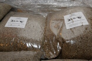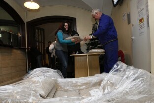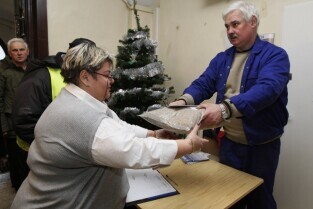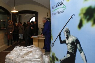 Urząd Miejski w Gdańsku przy ul. 3 Maja. Zimowa akcja dokarmiania ptaków, w ramach której mieszkańcom Gdańska rozdawana jest 5-cio kilogramowa mieszkanka nasion dla ptaków