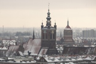Gdańsk, Góra Gradowa. Zimowa panorama Starego i Głównego Miasta. Kościół Św. Katarzyny, w tle Kościół Św. Jana