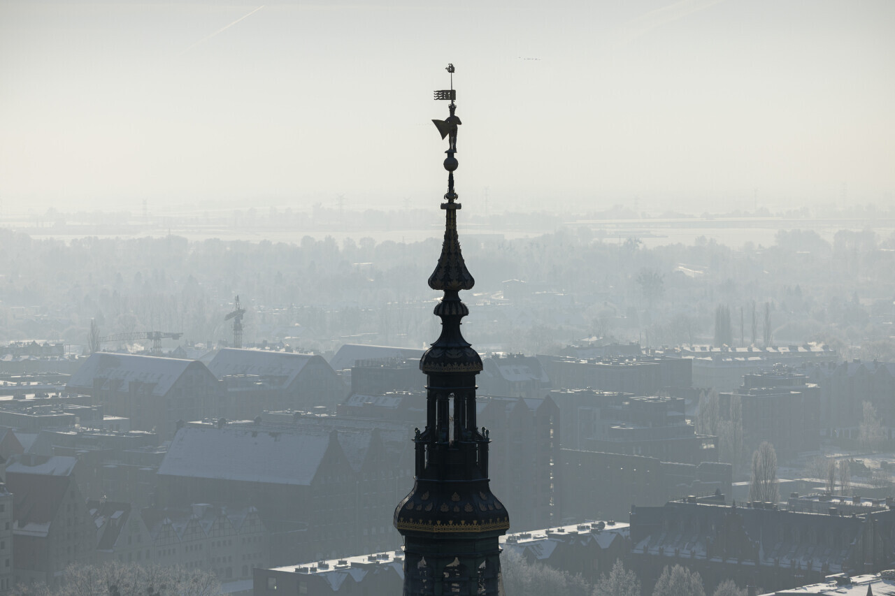 Gdańsk. Zimowa panorama miasta sfotografowana ze szczyty wieży Bazyliki Mariackiej. W dniu, w którym wykonano zdjęcia temperatura powietrza wynosiła -9 stopni Celsjusza. Nz. Figura króla Zygmunta II Augusta na szczycie wieży Ratusza Głównego Miasta