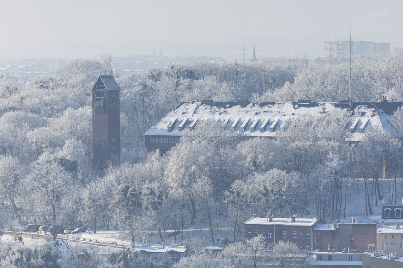 Gdańsk. Zimowa panorama miasta sfotografowana ze szczyty wieży Bazyliki Mariackiej. W dniu, w którym wykonano zdjęcia temperatura powietrza wynosiła -9 stopni Celsjusza. Nz. Biskupia Górka